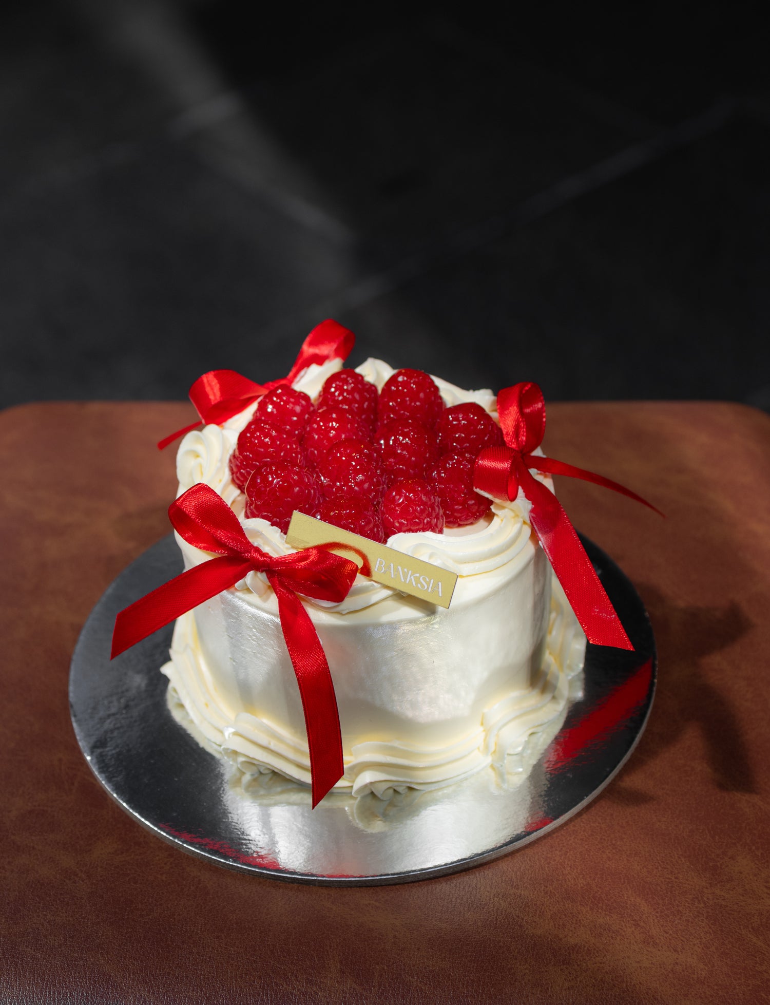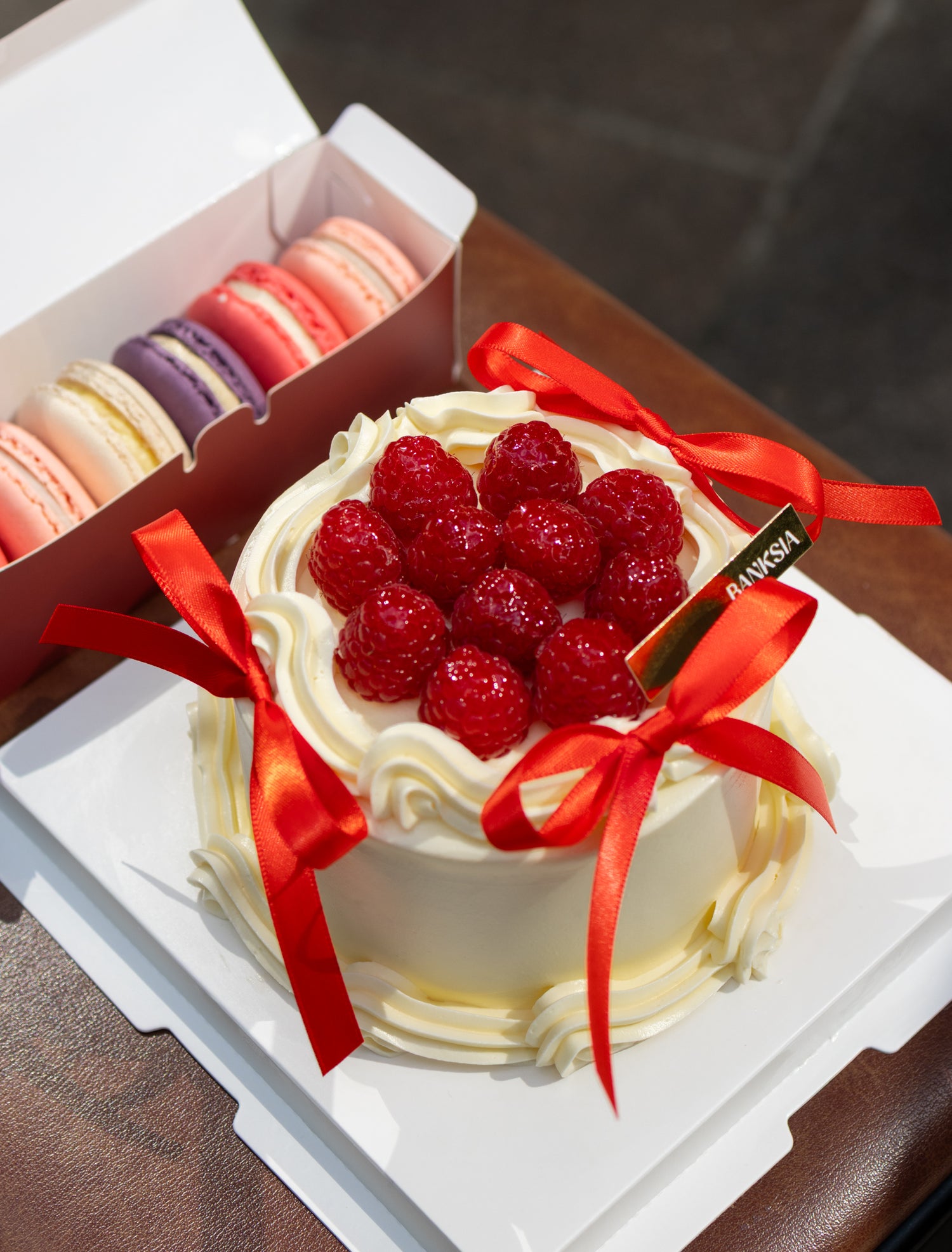 Vanilla sponge layered with strawberry jam and raspberry cream cheese. Finished with light vanilla buttercream, fresh raspberries and satin red